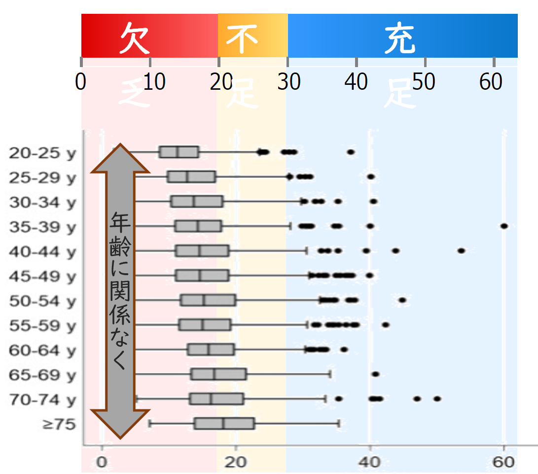 日本での調査で、約98%で不足(欠乏)しているとの結果があります。(下図)
